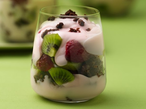 Reserve 1 tablespoon small brownie pieces for garnish. In each of 4 serving glasses, layer the remaining brownie pieces, the strawberries and kiwifruit.