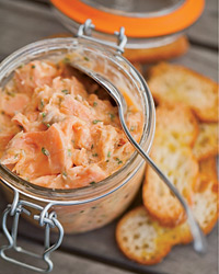 Fresh salmon is blended in with hot-smoked salmon to give the rillettes extra richness of flavor. A sophisticated yet rustic appetizer great for entertaining.