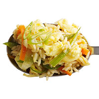 In a skillet, cook 4 beaten eggs in 1 tbsp oil; slice cooked egg and reserve. Add 1 tbsp oil, 2 ribs sliced celery and 1 each sliced onion, green pepper and carrot. Cook 6 minutes. Stir in 3 cups cooked rice, 1/2 cup vegetable broth, 3 tbsp soy sauce and 2 tbsp ketchup. Heat; stir in egg. Top with 2 chopped scallions. Serves 4.
