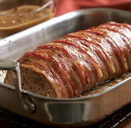 Preheat oven to 350 degrees. Beat eggs in a mixing bowl. Add milk, saltines, onion, salt, pepper and sage. Add ground beef. Mix. Form into loaf and put on ungreased pan. Mix ketchup, brown sugar and Worcestershire sauce in another mixing bowl. Cover meat with 1/2 the sauce, save the rest for when you serve. Cover meatloaf with bacon strips. Bake for 60-65 minutes. Enjoy!