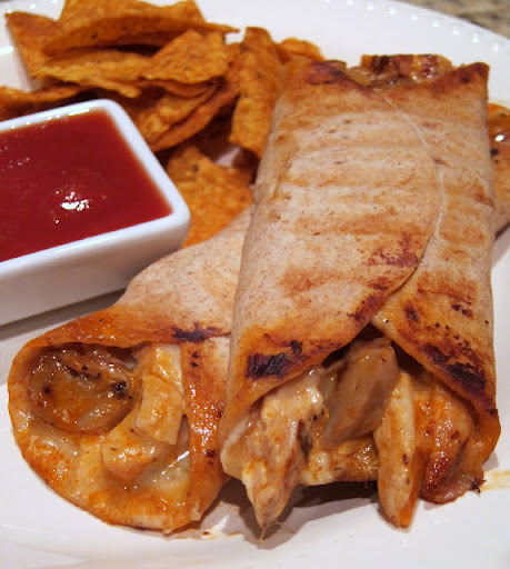 Roly Poly describes #65 as Sliced Chicken Breast, Melted Reduced Fat Cheddar Cheese, Mushrooms, Onions, Tomatoes, Spicy Wing Sauce, Grilled Golden Brown with a Side of Fat Free Ranch Dressing on a Whole Wheat Tortilla. My version is a little different. I used jalapeno jack cheese, omitted the onions and used some salsa instead of tomatoes. This was a huge hit! We had enough chicken to make wraps for lunch the next day. Sandwich night is quickly becoming our favorite night of the week!