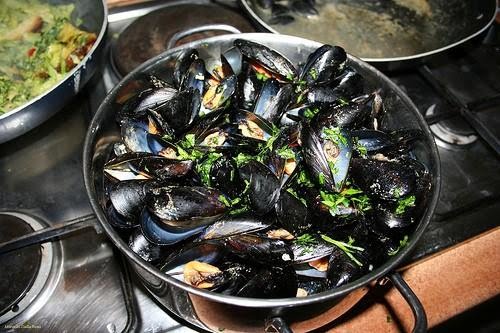 - 3 pounds of mussels, scrubbed, bearded and rinsed