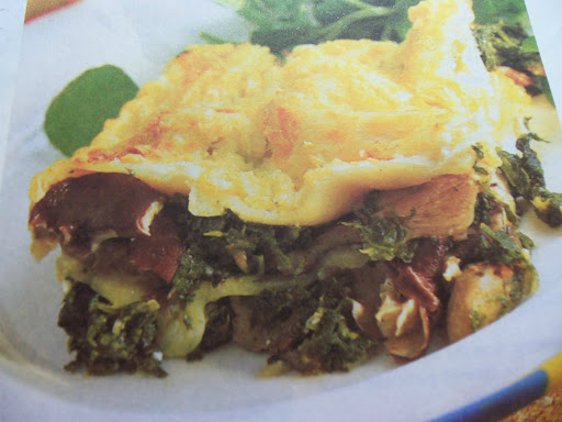Spread half of the musrhoom and spinach mix over the bottom of the prepared dish. Cover w/ a layer of lasagna, then w/ half of the cheese sauce. Repeat the process and sprinkle over the remaining Cheshire cheese.