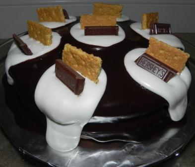 8.Transfer the frosting to a pastry bag fitted with a large round tip. Pipe dollops of frosting around the edges of the chilled cake and decorate with small rectangles of graham cracker and milk chocolate. Store the cake in the refrigerator until ready to serve, and allow it to sit at room temperature about 20 minutes before slicing and serving.