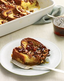 Preheat oven to 375 degress. Top with pecans and sprinkle with 3 tablespoons sugar. Bake, covered with parchment-lined foil, for 25 minutes. Uncover; bake until top is golden brown and crunchy, 20 to 25 minutes more. Serve with syrup.