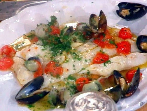 In a 14 to 16-inch saute pan, heat 4 tablespoons olive oil until almost smoking. Add the onions and garlic and saute 3 to 5 minutes, until soft and light golden brown. Add the tomatoes and the chili flakes and cook until tomatoes soften. Season fish with salt, and add to pan along with the shellfish.