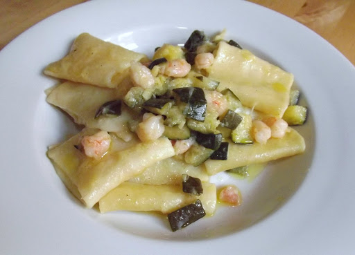 I had this at La Gavitella outside of Positano. I pieced the recipe together from memory of the meal, and I think it does it justice. Paccheri are large, smooth tubes, and have a great chewy texture. Combine them with rock shrimp and zucchini, and watch out.