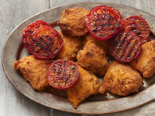 Meanwhile, brush the tomatoes with vegetable oil and season with salt and black pepper. Place cut-side down on the grill and cook until marked, about 4 minutes per side. Serve with the chicken.