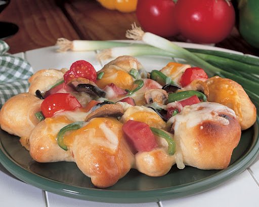 This novel idea using frozen rolls, ham, olives, mushrooms and cheeses is so fun and easy because if you can use a knife you've got the meal under control!