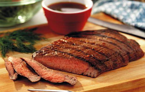 Drain the steak, reserving marinade. Grill steak 8 inches from the heat until done to taste, about 8 to 10 minutes per side for medium. Let stand for 10 minutes.