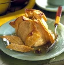 Place dumplings, seam side down in lightly greased baking dish and bake until lightly golden, about 1 hour. Transfer to plates and spoon any syrup from the dish over the apples. Serve warm with ice cream.