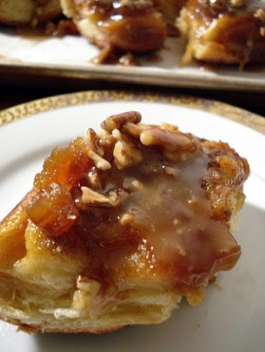Preheat oven to 400 deg. Grease 9" square pan. Place apples, 1 T brown sugar & 1 T butter on parchment-paper-lined baking sheet; toss to coat. Cover loosely with foil & roast until tender (15 mins). Lower temp to 350. Blend flour, sugar, baking powder & 1/4 t salt at low speed. Add 5 T butter & mix until crumbly. Whisk eggs with 1/2 c cream, then mix into dry ingredients. Roll out dough to form 9" rectangle. Mix 1/2 c brown sugar, pecans & cinnamon. Cut up 2 T butter & dot the dough. Sprinkle brown sugar mix on top & cover evenly with the apples. Roll up dough, jelly roll style, and cut, crosswise into 9 slices. Place the slices cut side down in the prepared baking pan. Bake until golden; 35-40 mins. Transfer to rack to cool. Bring remaining 4 T butter, 3/4 c brown sugar, 1/2 c cream, 1/2 salt & honey to boil.