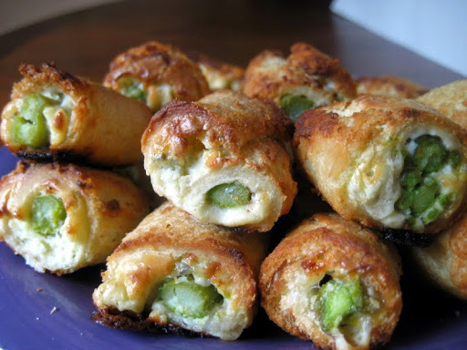 Cut the ends off the bread. Flatten. Mix the crumbled bacon with the cream cheese. Spread the cheese on bread. Place asparagus spear on bread and roll up. Cut in half. Brush with butter. Bake at 325 for 20 mins or until crispy.