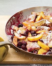 In the skillet, melt 1 tablespoon of the butter. Add the batter, cover and cook over moderately low heat until it is golden on the bottom and the top is beginning to set, 4 to 5 minutes. Slide the pancake onto a large plate. Carefully invert the skillet over the pancake. Using oven mitts, flip the skillet and the plate to return the pancake to the pan. Cook until the underside of the pancake is set and lightly browned, about 2 minutes.
