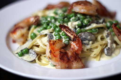 3. Heat olive oil in a skillet over medium-high heat. Add garlic and fry briefly, and then add mushrooms. Cook until soft and then add frozen peas. Sprinkle with a pinch of salt and pepper, and stir until peas are hot and cooked through, about 3 to 5 minutes. Stir vegetable mix into prepared cream sauce. Serve over bed of fettucini, and top with bacon wrapped shrimp.