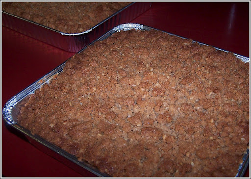 Make topping by combining 1 cup flour with brown sugar, 1/2 cup softened butter and 1 teaspoon cinnamon in a bowl. Mixture should have the consistency of moist sand. Add 1/2 cup chopped pecans.