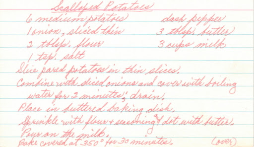Slice pared potatoes in thin slices. Combine with sliced onions and cover with boiling water for 2 minutes; drain. Place in buttered baking dish. Sprinkle with flour & seasoning and dot with butter. Pour on the milk.
