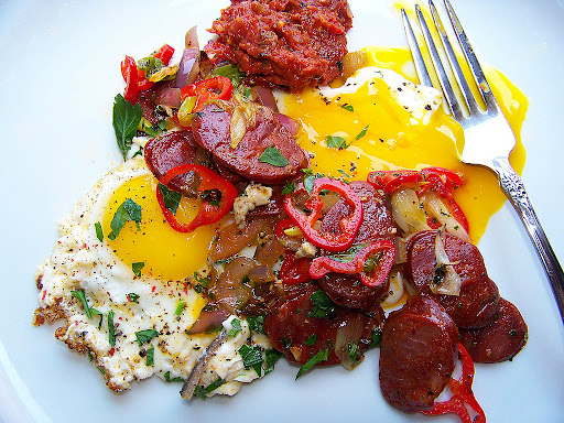 Photo shows the chorizo served with fried eggs....looks DELICIOUS!