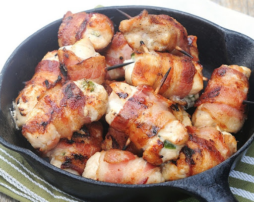 Chicken spread with cream cheese and jalapenos, rolled and wrapped with bacon, then grilled.