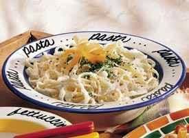 2. While fettuccine is cooking, heat margarine and milk in 2-quart saucepan over low heat, stirring constantly, until margarine is melted. Stir in cheese, salt and pepper.