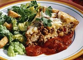 1. Heat oven to 400ºF. Grease 9-inch pie plate. Spread ricotta cheese in pie plate; sprinkle with Parmesan cheese. Cook ground beef until brown; drain. Stir in 1/2 cup of the mozzarella cheese, 1/2 cup spaghetti sauce and the salt; spoon evenly over cheeses.