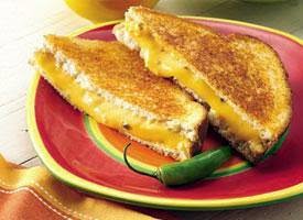 3. Place sandwiches, buttered sides down, on hot griddle. Spread top sides with remaining butter mixture. Cook 5 to 7 minutes, turning once, until golden brown on both sides and cheese is melted. Serve with salsa as a dip.
