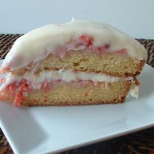 Layers of angel food cake bits, sugared strawberries, pudding and whipped cream topped off with more whipped cream and strawberries!