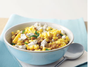 In a large bowl, combine the corn, jalapeños, lime juice, oil, walnuts, 1/2 teaspoon salt, and 1/4 teaspoon pepper. Sprinkle with the Feta before serving.