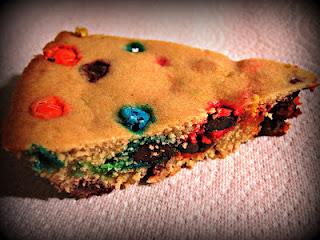 Cream butter and sugar. Add in egg and extract and blend. The combine flour and baking soda- mix until completely incorporated. Fold in the M&M's. Dump into a greased 9.5" pie pan and bake for 25-30 mins. You know the drill, when a toothpick/ridiculously small pairing knife comes out clean it's done.