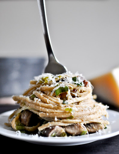 As soon as pasta is finished, reserve 1/2-3/4 cup liquid, drain pasta and immediately throw into the skillet. Toss with the leeks and mushrooms to coat, then remove from heat. With a large spoon in one hand, add the egg mixture right on top and immediately begin stirring the pasta together. I usually stir for a good minute or two. At this time if desired, add the pasta water to the skillet to make things a bit more creamy and saucy. Toss in bacon. Serve immediately with extra cheese!