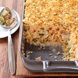 5. Scrape mixture into 13 by 9-inch baking dish (casserole can be refrigerated without topping for up to 24 hours; increase baking time to 25 minutes, adding topping halfway through baking) and top with bread-crumb mixture. Bake until golden brown, 12 to 14 minutes. Let casserole cool on wire rack for 10 minutes. Serve.