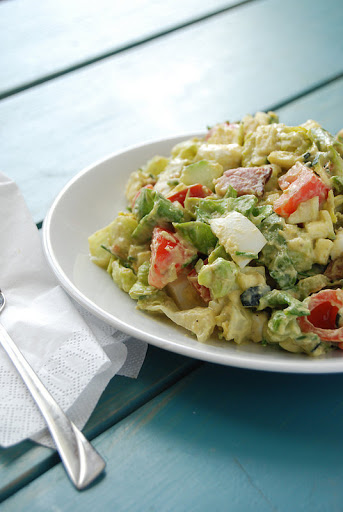 Dollop all the avocado dressing on top of the salad and toss. The water from the vegetables will thin out the salad dressing.