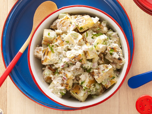 Place the potatoes on the grill, cover and cook 5 minutes, then rotate them 90 degrees F and cook 5 to 10 more minutes. Flip the potatoes and repeat on the other side. They should be slightly puffed and golden brown. Remove and allow to cool completely. Dice into 3/4-to-1-inch pieces.