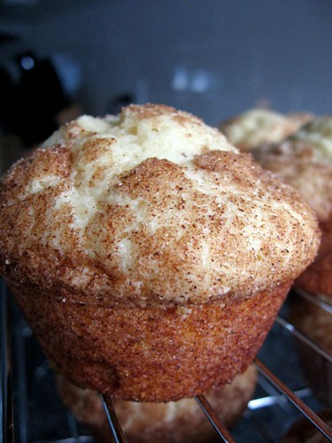 4. Using an ice cream scoop, scoop out muffin batter one at a time and drop into a shallow bowl filled with the cinnamon sugar mixture. Roll the muffin around in the mixture until it is covered completely in cinnamon sugar. Place muffin into muffin tin. Depending on the size of your tins, you should get about 12 to 14 muffins. Bake them for approx. 20-22 minutes in a 350F oven or until they are golden brown.