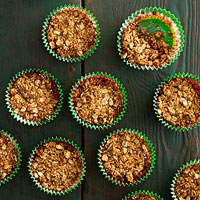 3. Line two 12-cup muffin tins with paper wrappers. Scoop 2 tbsp of the peanut butter and oats mixture into each wrapper, pressing down well with a spatula. Spread 2 tsp of the preserves over peanut butter and oats mixture in each cup. Add 2 more tbsp peanut butter and oats mixture to cover preserves, pressing down well with a spatula.