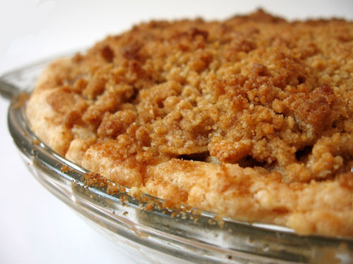 To assemble the pie, layer the apple slices into the pie crust, staggering the slices so they tower towards the center. Pat crumbs onto apples to form the top crust.