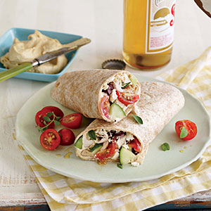 Spread 1 tablespoon hummus over 1 side of each tortilla. Top each tortilla with about 1/2 cup chicken mixture.