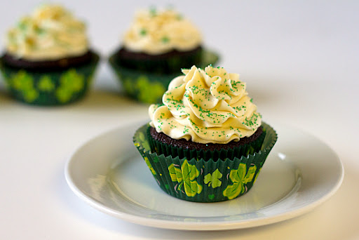 1. To Make the Cupcakes: Preheat oven to 350 degrees F. Line 24 cupcake cups with liners. Bring the Guinness and butter to a simmer in a heavy, medium saucepan over medium heat. Add the cocoa powder and whisk until the mixture is smooth. Cool slightly.