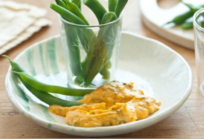 When carrots are cool, add sour cream, mayonnaise, shallot, salt and cayenne to the food processor and process until smooth. Add dill and pulse until combined. Transfer dip to a bowl and serve with green beans for dipping.