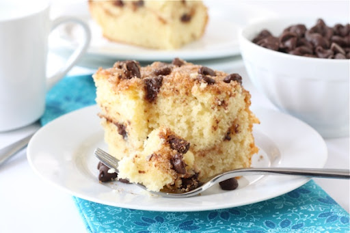 This sour cream coffee cake is light, fluffy, and has a tunnel of cinnamon and chocolate chips inside. The cake also gets topped with cinnamon, sugar, and chocolate chips. The cinnamon sugar topping makes the cake sparkle and gives the cake a nice crunchy top. This chocolate chip coffee cake is really easy to make.