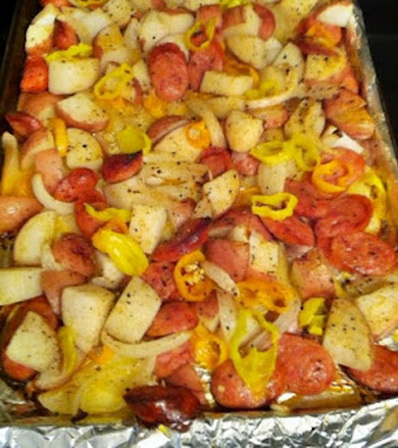 Add salt, pepper and spices (if using.) Top with the sliced banana peppers. Bake at 400 degrees for about 30-35 min, until potatoes are tender.