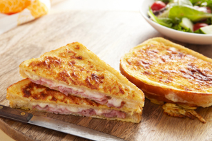 1 slice ham, 2 Tbsp. Gruyère, and remaining béchamel. Broil sandwiches until cheese is brown and bubbly, 5–7 minutes. Stack one open-faced sandwich on top of another to form one double-decker sandwich; repeat