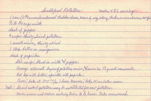 This recipe comes from the same collection as the previous scalloped potatoes recipe, handwritten on a white index card and the date is unknown. (RECIPE CURIO)
