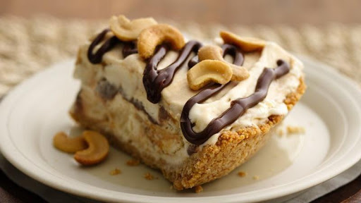 5 To serve, let pie stand at room temperature for 15 minutes. Cut into wedges; place on individual dessert plates. Top with remaining ice cream topping and cashew halves.
