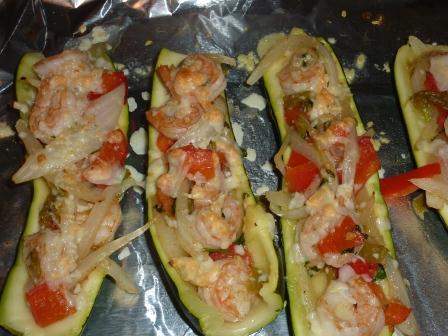 Place the zucchini on a cookie sheet (I lined mine with foil) and fill each with the shrimp mixture. Top with parmesan cheese. Place in the oven under the broiler (on low) just until the cheese melts and starts to brown (1-2 minutes).