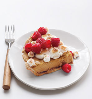 Heat oven to 350°. Chill crust 15 minutes. Remove from fridge; prick crust at 1-inch intervals with a fork. Line with waxed paper; fill with pie weights or uncooked rice. Bake until golden, 30 minutes. When crust is cool, lift waxed paper to remove weights. Increase oven heat to 400°. Spread jam on crust to cover bottom. In a bowl, whisk eggs and vanilla. In a thick-bottomed pot (to prevent burning), whisk milk with peanut butter and sugar over medium heat until steaming; remove from heat. Whisk peanut butter mixture into egg-vanilla mixture until combined; spoon filling into crust. Bake until filling is set at edges but center jiggles when you shake pan, 15 minutes. Heat broiler. Top pie with marshmallows; broil, rotating once or twice for even browning, until marshmallows are puffed and golden, 1 to 2 minutes. Let cool for at least 3 hours. Top with raspberries and serve.