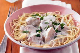 COOK pasta as directed on package about 15 min. before chicken is done; drain. Serve topped with chicken mixture and parsley.