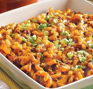Brown beef in a skillet over medium heat; drain. Stir in tomato sauce and seasoning mix. Bring to a boil and remove from heat. Combine cooked macaroni, sour cream and 1/2 cup Cheddar cheese in a bowl. Spoon macaroni mixture into a lightly greased 13”x9” baking pan. Top with beef mixture and remaining cheese. Bake, uncovered, at 350 degrees for 30 minutes, or until hot and bubbly. Garnish with green onions.