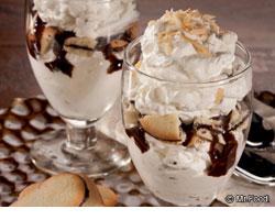 Layer half cream mixture in stemmed glasses; top with 1 tablespoon fudge sauce. Repeat layers; sprinkle evenly with remaining coconut.