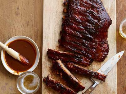 Remove the ribs and carefully unwrap. Return to the cooler side of the grill, meat-side up; cook, basting generously with the sauce halfway through, until the meat is tender, about 1 more hour. Remove the racks and let rest a few minutes before slicing. Serve with the remaining sauce.